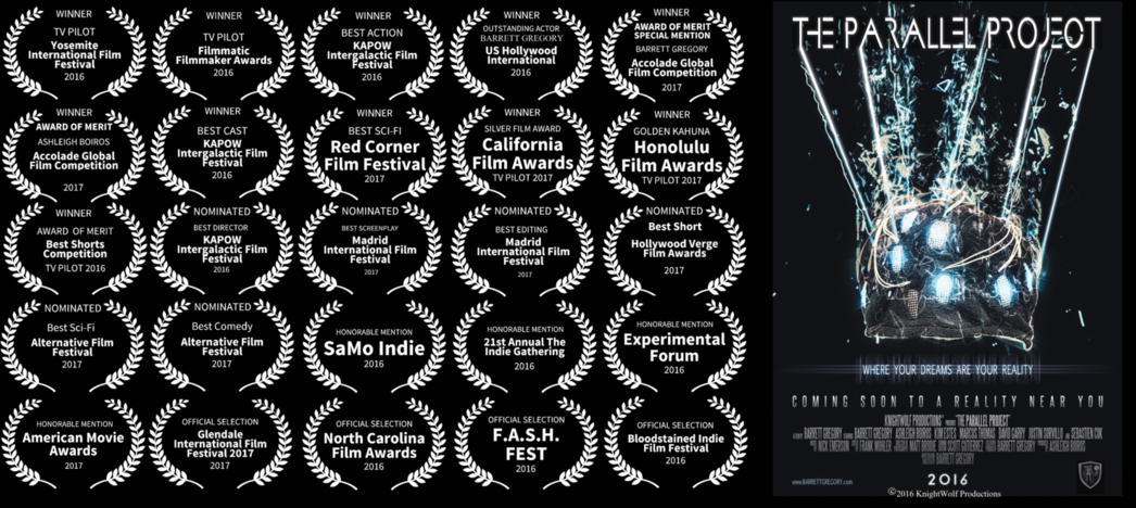 Produced through my production company, KnightWolf Productions LLC, The Parallel Project filmed in several locations in Los Angeles, CA. Working with SAG-AFTRA, we were able to get a fantastic cast, one of whom is now an EMMY winner! We also have a great editor, sound designer, director of photography and composer! Check out the crew page for more info - I was fortunate enough to work with an amazing crew, fantastic cast and use wonderfully unique locations!